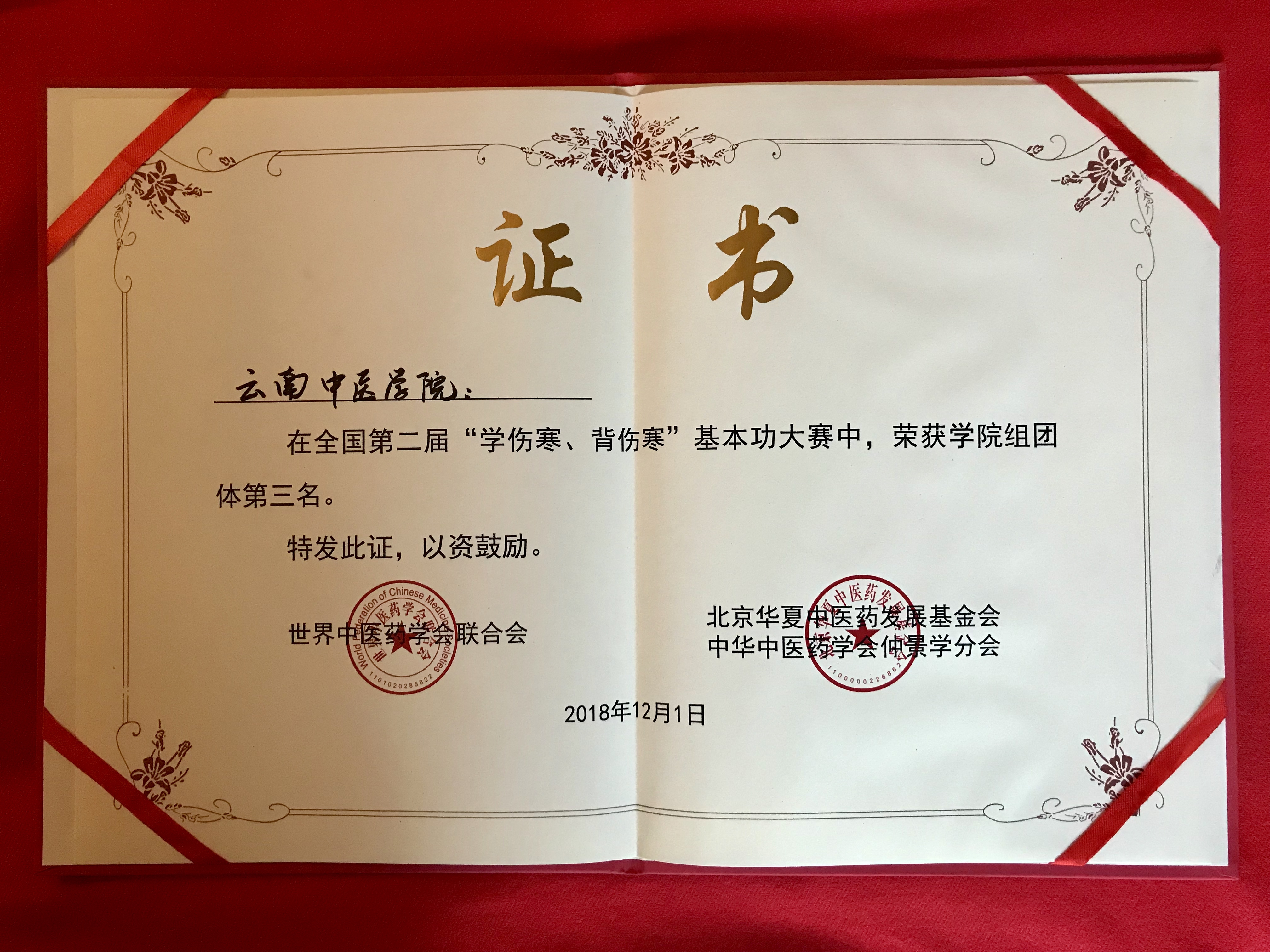 2018年中医经典教学团队辅导同学参加全国第二届“学伤寒、背伤寒”基本功大赛团体赛获得第三名。