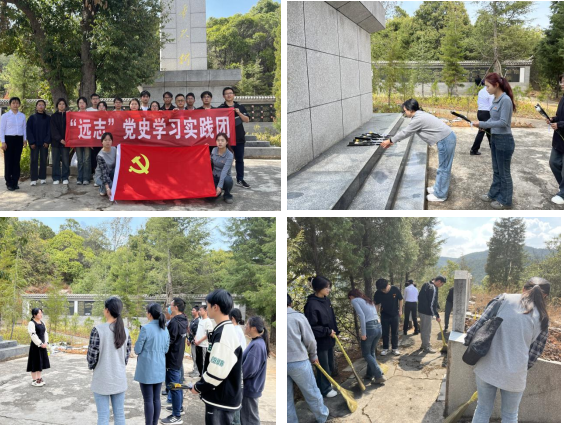 同学们认真清理烈士陵园内的落叶、杂草、枯枝,依次敬献鲜花,表达对革命先烈们的缅怀、崇敬与哀思。随后一起瞻仰烈士纪念墙,“远志”党史学习实践团的赖周美同学向师生们详细讲述了纪念墙上161名烈士在土地革命、抗日战争、解放战争、抗美援朝、社会主义建设和改革开放等各个历史时期的英雄事迹。同学们通过一幅幅生动的历史图片、一个个令人动容的革命故事,深深感受烈士们投身革命,矢志不渝的精神。
