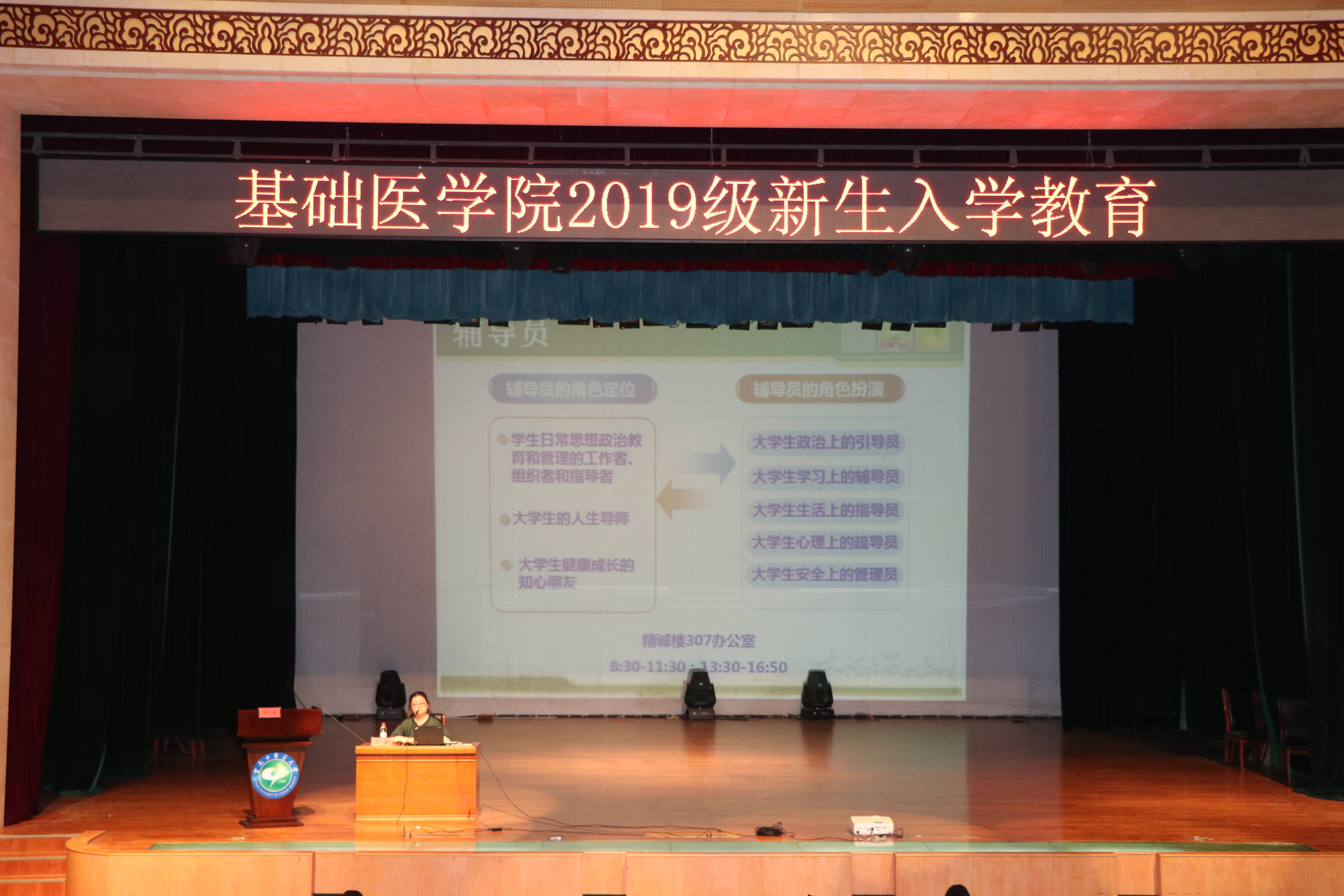 8月30日,基础医学院在兰茂堂举行新生入学教育,会议分阶段由卞瑶书记和张毅副书记主持。