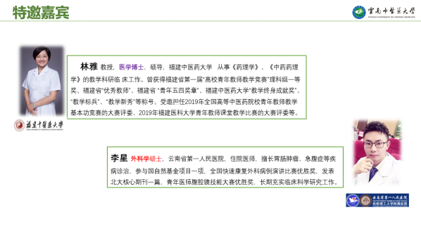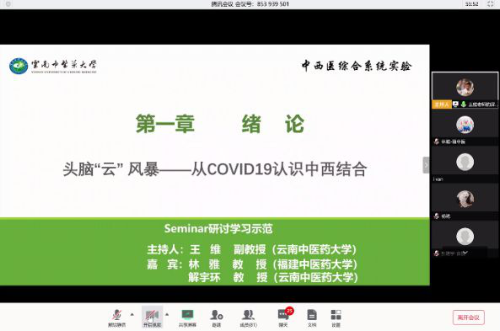《中西医综合系统实验课》是学院承办中西医临床专业,为适应学分制改革形势下新增设的一门公共选修课。旨在通过理论结合实践的团队学习模式,初步培养学生中西医科研思维及实验能力。为此,本节公开课从“新冠肺炎的中西医诊疗”入手,特别邀请了福建中医药大学教学终身成就奖获得者林雅教授及云南省万人计划青年拔尖人才解宇环教授共同参与,力争为师生搭建一个“云”头脑风暴的平台。