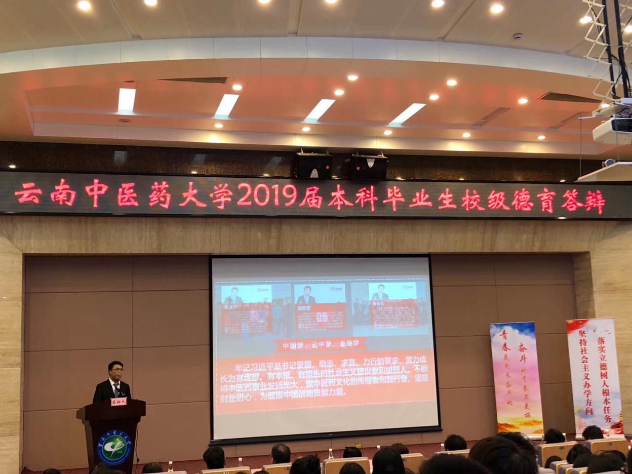 云中讯( 通讯员 陆昕 龙光鸿 2019年5月 30 于云南中医药大学在翰墨楼一楼报告厅举行 2019届本科毕业生校级德育答辩,15级医学实验技术班姚金玲同学代表基础医学院参加答辩。姚金玲同学以“立根筑梦少年志,千磨万击还坚劲”为题从六个方面阐述了自己对中国梦、云中梦、金玲梦的理解。他不忘初心,勇立潮头,牢记习近平总书记爱国、励志、求真、力行的要求,用创业的精神和创新的意识努力做中医药文化的传播者和践行者。