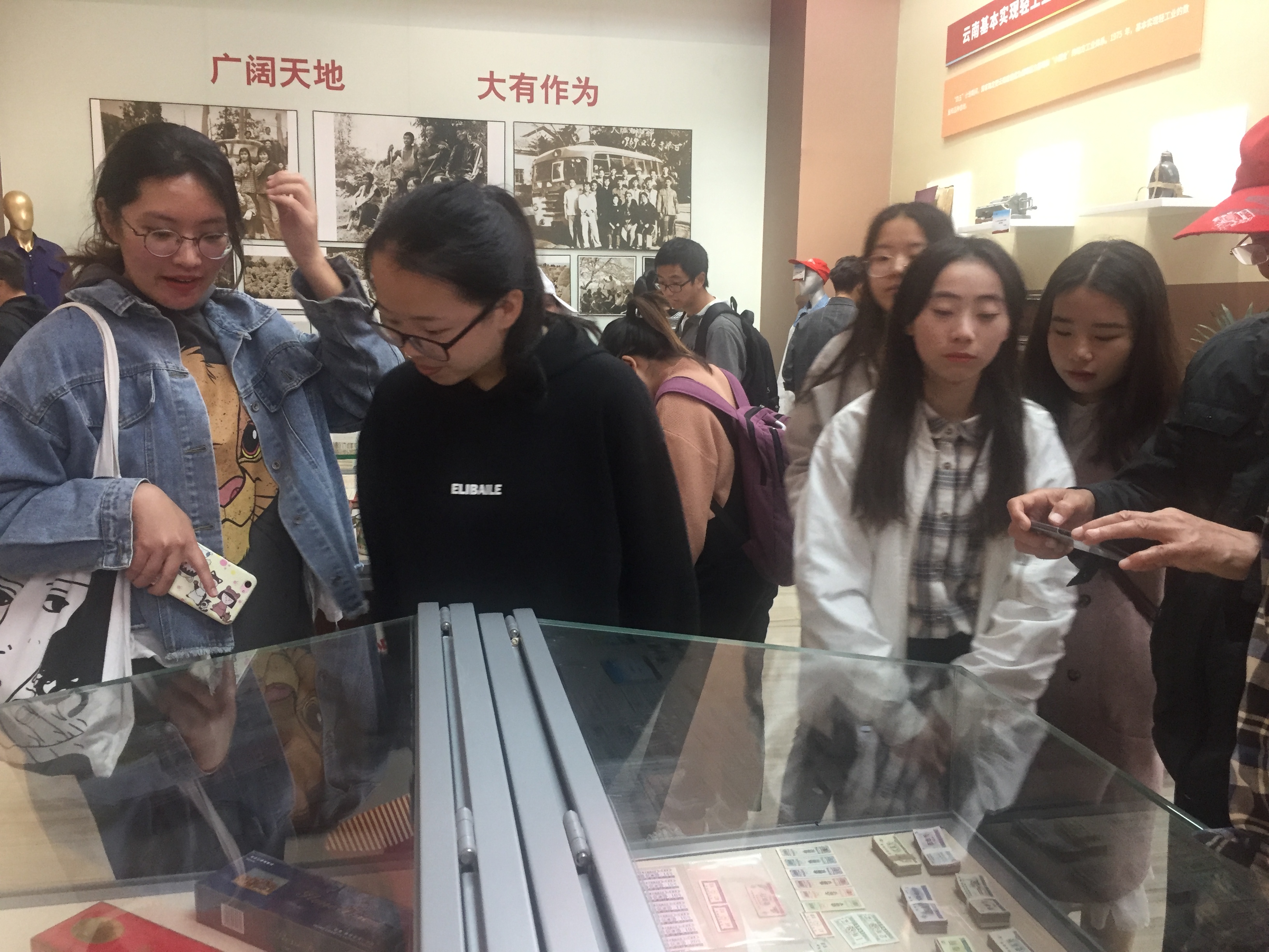 抵达云南文学艺术馆,一个“70”字样的花篮映入眼帘,同学们饶有兴趣地按时间顺序展开参观。走进大厅,首先看到的是一些富有年代气息的老物件,一下子就引起了同学们的强烈兴趣,曾经的留声机、放映机、大哥大、自行车到今天的3D电影、智能手机、私家车,人民的物质生活发生了翻天覆地的巨大变化,人民的幸福感、获得感更是不断上升。