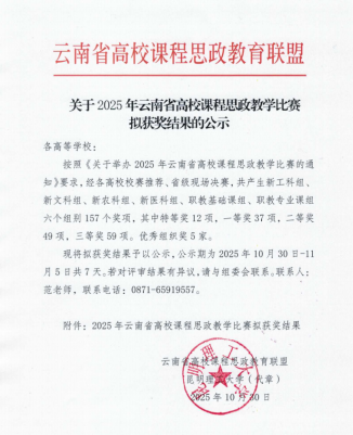 1030日,云南省高校课程思政教育联盟公布了2025年云南省高校课程思政教学比赛获奖名单。我院教师汝晶荣获二等奖、宋一男荣获三等奖。
