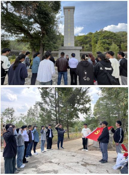 活动伊始,学生第五党支部全体党员在晋宁长松山革命烈士陵园“革命烈士永垂不朽”纪念碑前整齐列队、庄严肃立,鞠躬默哀,持鲜花拾级而上,在革命烈士纪念碑前深情凝视、缅怀先烈,绕革命烈士纪念碑一周,依次将鲜花摆在革命烈士纪念碑石阶上寄托哀思。英烈们坚定的信仰、英勇的事迹让大家接受了一次深刻的党性教育和精神洗礼。随后,全体党员面对党旗,重温入党誓词,以铿锵有力的誓言,表达必将不负革命先辈遗志的坚定信念。