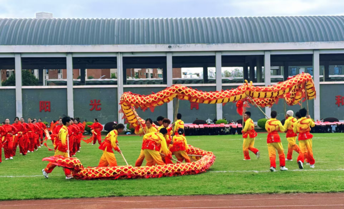 运动场上,金龙腾跃,青春如火。由同学们带来的舞龙、彩带、翻牌拼图等表演惊艳全场。长龙在他们的操控下腾挪翻转,时而昂首向天,时而盘旋低回,如流动的金色火焰,点燃了整个赛场,生动演绎了团结协作、奋勇拼搏的青春力量。