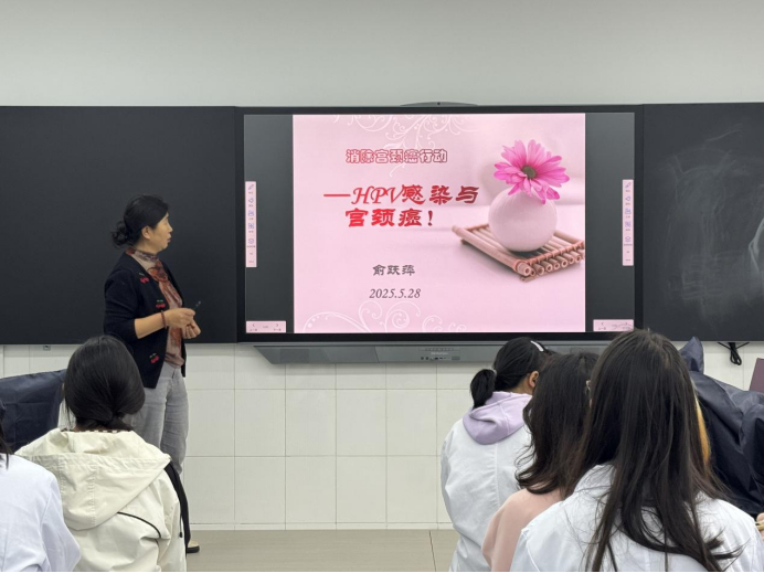 俞跃萍主任以“科学防癌,守护‘她’健康”为主题,深入解析了宫颈癌防治的核心知识。她利用详实的数据,阐释了宫颈癌的流行病学现状及其明确的病因,清晰地描绘了疾病的发展进程,并特别强调了早期筛查在改变疾病预后中的关键作用。在讲座中,俞主任详细讲解了国际和国内推崇的宫颈癌三级预防策略,特别是对HPV疫苗的科学原理、适宜接种人群以及最佳接种时机进行了权威性的科普教育。同时,她还介绍了宫颈癌筛查的具体方法及其深远的意义。俞主任特别指出,宫颈癌作为目前唯一病因明确、可防可控的恶性肿瘤,破除认知误区、积极参与筛查是减轻社会疾病负担的关键。她对在场的医学生寄予厚望:“未来,你们不仅是治疗疾病的医生,更应成为健康知识的传播者、健康行为的倡导者,要勇于承担责任,为保障女性健康权益贡献自己的专业力量。”