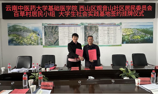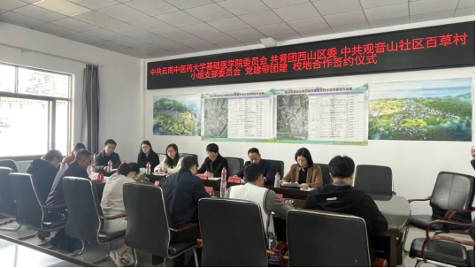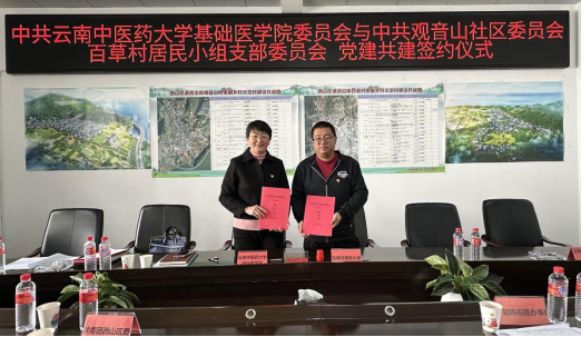 为深入学习贯彻党的二十大和二十届二中、三中全会精神,通过党建引领,促进校地合作,推进乡村振兴,12月6日上午,基础医学院党委与昆明市观音山社区委员会百草村居民小组支部委员会、西山区观音山社区居民委员会百草村居民小组举行党建共建合作协议签约仪式暨大学生社会实践基地挂牌仪式。共青团西山区委书记刘秋苹、西山区碧鸡街道党工委组织委员李金龙、观音山社区委员会百草村小组党支部书记王洪新、西山区观音山社区居民委员会百草村小组组长王学、基础医学院党委书记孙雪萍、校团委书记浦仕通出席了签约和挂牌仪式。活动由西山区观音山社区居民委员会百草村小组组长王学主持。
