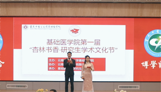 1月9日下午,基础医学院第一届“杏林书香·研究生学术文化节”闭幕式在翰墨楼一楼报告厅隆重举行。基础医学院党委书记孙雪萍、研究生处副处长王维、基础医学院副院长羊忠山、云南尊灏经贸有限公司总经理陆继湛、副总经理朱家吉出席了闭幕式活动,全体研究生以及本科生代表共200余人参加了活动。