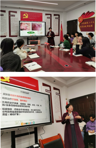 (通讯员:孙艳红、张胜)2023年11月23日下午,在精城楼304会议室,基础医学院教师第一支部与学生第一支部、学生第五支部开展基础医学院师生党支部“一对一”结对共建活动。基于党建业务相结结合,以党建促业务,基础医学院教师第一支部党员罗光云同志结合自己的专业特长为广大党员做了“常见皮损辨识及外用药的治疗原则”的讲座,指导大家学习中医美容保健知识。罗光云同志理论与临床实例相结合,向大家介绍了临床常见皮损的特点、鉴别要点以及外用药的运用原则。在讲授过程,罗老师鼓励学生党员要有中医自信,充分发挥中医药独特优势,提高中医药服务能力,发展中医养生保健治未病服务,大力传播中医药知识和易于掌握的养生保健技术方法,实现中医药健康养生文化创造性转换、创新性发展,并指导和服务于社会大众。罗光云同志的讲座既专业适用,又幽默风趣,受到广大党员的喜爱。