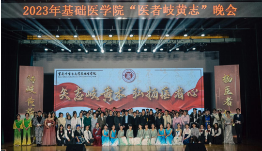 传岐黄精神,育杏林人才,扬国粹精华,2023年11月24日晚,基础医学院在在呈贡校区兰茂堂举办了第四届“医者岐黄志”文艺晚会。本次活动由基础医学院团委、学生会组织承办。莅临本次晚会的嘉宾有校团委、学工部、研工部第三附属医院教学部的领导与及学院党建共建单位昆明市呈贡区洛龙街道宜和社区党委的领导。基础医学院党政领导出席了本次晚会,学院1400余名同学观看了本次晚会。