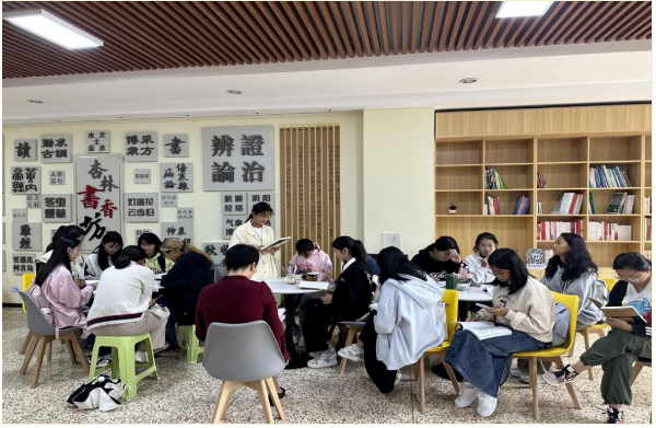 2023年9月28日上午,基础医学院在“一站式”学生社区精诚楼一楼大厅“杏林书香坊”开展了第二期读书分享会。本期活动以《医学三字经》“医学源流第一”为主要内容进行了读书分享活动,活动由基础医学院党委书记孙雪萍主持,2023级中西医临床4班的18名同学参加了活动。