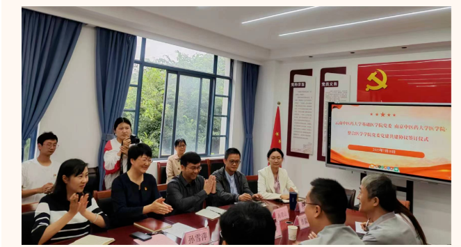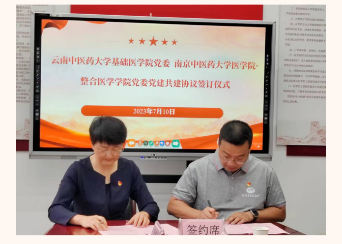 为深入学习贯彻习近平新时代中国特色社会主义思想主题教育,适应新时代基层党建新形势、新要求,不断探索特色鲜明高水平中医药大学党建新模式,7月10日在云南中医药大学精诚楼304会议室,基础医学院党委与南京中医药大学医学院•整合医学学院党委举行了党建共建签约仪式。云南中医药大学基础医学院全体党委委员、南京中医药大学医学院•整合医学学院党委书记张军、副书记燕珂及两校师生代表参加了仪式。