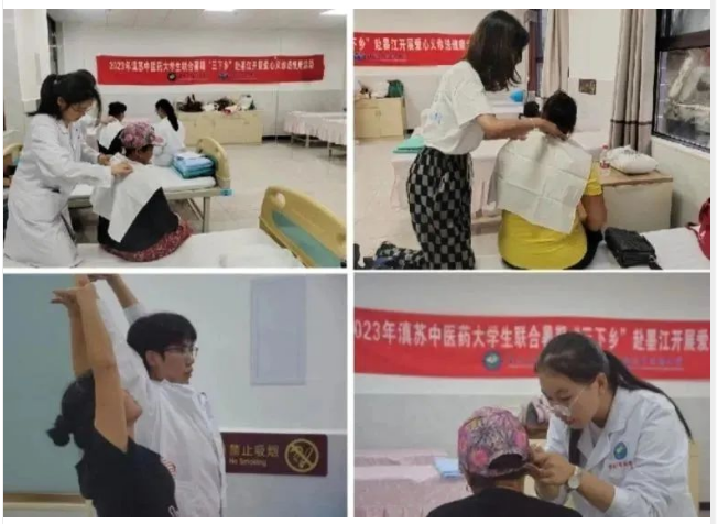 志愿者同学们积极为村民发放免费药品,细心讲解药品的功效和使用方法。村民们称赞:“这些药好多在我们乡下都买不到,你们真好啊,为我们免费上门送医赠药,用真心真情守护我们的生命健康安全,谢谢你们啦!”一份份药品送到群众手上,一份份关心和温暖也送进群众心里,村民们充满感激的话语和真挚的眼神,让师生们更坚定了传播中医药文化,全力促进了乡村振兴的信心和决心。多次培训的推拿耳穴手法在此刻发挥了重要的作用,志愿者同学娴熟地为村民开展推拿和贴耳穴,一边向他们普及中医药文化知识和一些康养技巧,一边倾听他们分享当地特色,大家都乐在其中。