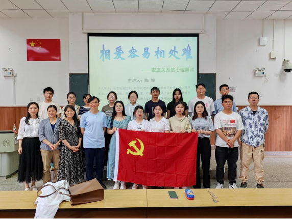 为深入贯彻习近平新时代中国特色社会主义思想主题教育实施方案,落实党建与业务“深度融合”要求,充分发挥党建共建示范引领作用,培养研究生的健康心理,促进研究生成人成长成才,2023年5月11日基础医学院教师第三党支部与学生第四党支部在呈贡校区弘毅楼1304教室开展了第一期“一对一”支部结对帮共建帮扶活动。本次活动邀请教师第三党支部陈嵘副教授进行了题为《相爱容易相处难——家庭关系的心理解读》的讲座。讲座由蒋成婷主持,教师第三党支部与学生第四党支部(研究生支部)全体党员参加了讲座。