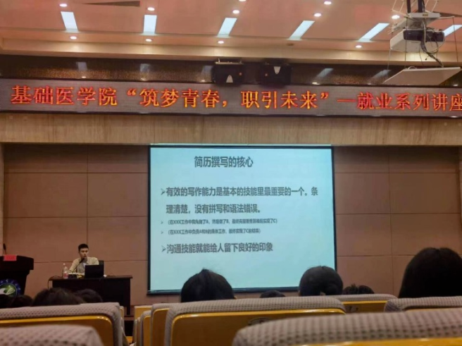 为贯彻落实《基础医学院就业促进周和百日冲刺工作方案》精神,进一步推进2023届毕业生就业工作,引导学生树立正确的就业观和积极的求职心态,6月7日,基础医学院邀请云南中医颜志群为我院2023届毕业生在翰墨楼一楼报告厅开展就业讲座,基础医学院党委副书记赵文娟主持,学工办辅导员杨洋、张磊、张寒梦做就业指导。