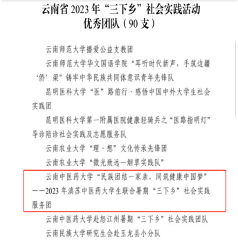 近日,共青团云南省委下发《关于2023年云南省大中专学生志愿者暑期文化科技卫生“三下乡”社会实践活动优秀单位、优秀团队、先进个人和特色品牌项目的公示》,我院“民族团结一家亲,同筑健康中国梦”——2023年滇苏中医药大学生联合暑期“三下乡”社会实践服务团队荣获云南省2023年“三下乡”社会实践活动优秀团队,我院孟卓然老师荣获云南省2023年“三下乡”社会实践活动先进个人。